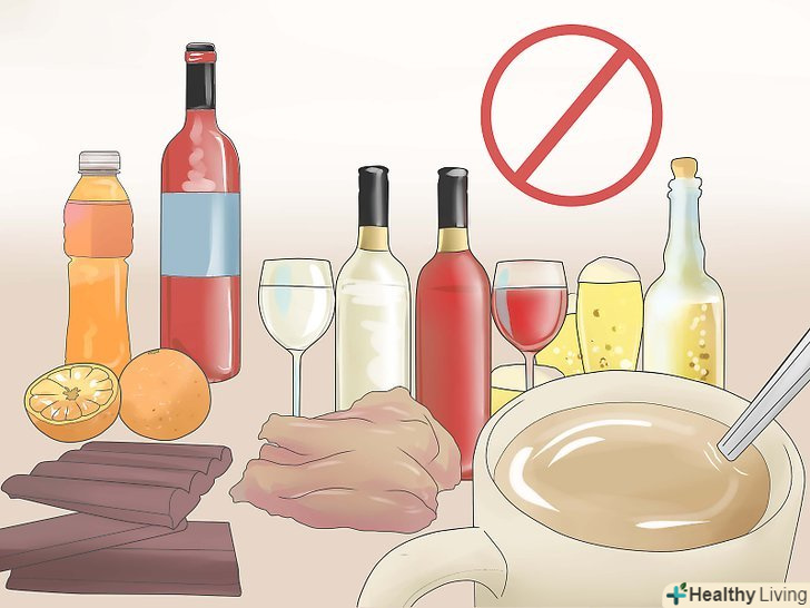 Перестаньте вживати продукти, що провокують рефлюкс.кислотний рефлюкс часто викликається вживанням в їжу тих чи інших продуктів, які також називаються "продукти-провокатори". Спробуйте викреслити такі продукти зі свого раціону і подивіться, чи не покращилася ситуація з рефлюксом. Якщо вирішите спробувати цей метод, вам слід відмовлятися не від одного продукту за раз, так як продуктів-провокаторів у вашому раціоні може бути кілька, а зрозуміти, що саме вам шкодить, буде складно. Краще поступите так: на два тижні відмовтеся від всіх продуктів-провокаторів, потім раз в три дні повертайте в раціон по одному продукту. Все, після чого буде з'являтися рефлюкс, варто назавжди викреслити з раціону (або більш ніж серйозно обмежити).[4]- Серед продуктів-провокаторів можна назвати кофеїн, шоколад, алкоголь, м'яту, томати, апельсини, гостре і жирне.