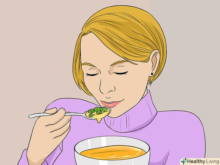 Багато відпочивайте, щоб організм відновлювався.організму необхідний відпочинок, щоб швидко прийти в норму. Під час хвороби найкраще взяти лікарняний. Зручно влаштуйтеся в ліжку або на дивані і не перенапружуйтеся. Намагайтеся спати протягом дня, оскільки застуда може виснажити організм. Якщо під час сну утруднюється дихання, спробуйте підняти голову вище за допомогою подушки, щоб зменшити закладеність носа.- Якщо ви хворієте вдома, спробуйте пити часниковий суп. Попросіть близьких приготувати суп для вас або приготуйте його самостійно, якщо дозволяє самопочуття. Він допоможе вам послабити симптоми застуди і поліпшити самопочуття.
