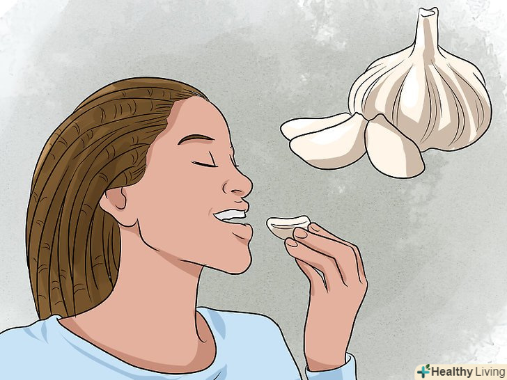 Вживайте в їжу сирий часник.якщо вас не бентежить гіркий смак, можна вживати часник в їжу прямо в сирому вигляді. Роздушіть часник в ложці меду або оливкової олії, щоб зробити смак більш приємним. При щоденному вживанні часник зміцнить імунну систему, яка захистить вас від вірусів і прискорить процес одужання.- При надмірному вживанні часнику може виникати неприємний запах з рота і знижується кров'яний тиск, тому краще обмежуватися 2-4 зубчиками в день.