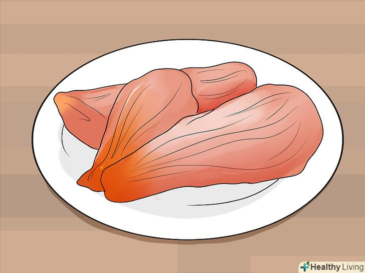 Приготуйте власний бульйон з курячих стегенець і води.натуральний курячий бульйон можна приготувати з нежирного курячого м'яса. Так вам буде простіше контролювати кількість натрію в бульйоні. Краще використовувати курячі чверті, оскільки в них вище співвідношення м'яса до кістки. Видаліть всю видиму шкіру і жир з м'яса. Потім налийте у велику каструлю приблизно 2-3 склянки води і додайте курячі стегенця.[3]- Чим менше ви візьмете води, тим більш насиченим і концентрованим вийде бульйон.