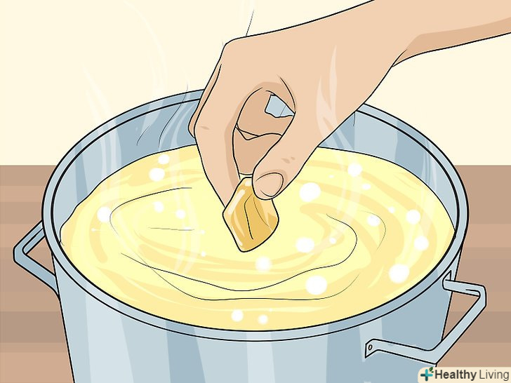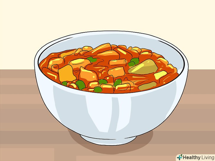 Використовуйте бульйонний кубик в якості простого рішення.при використанні бульйонного кубика або основи для супу налийте в миску або каструлю приблизно дві склянки води. Потім доведіть воду до кипіння на плиті або в мікрохвильовій печі, додайте основу або бульйонний кубик і розмішайте до розчинення.- При використанні бульйонного кубика наступний крок можна пропустити. Просто налийте порцію теплого бульйону в чашку або тарілку.