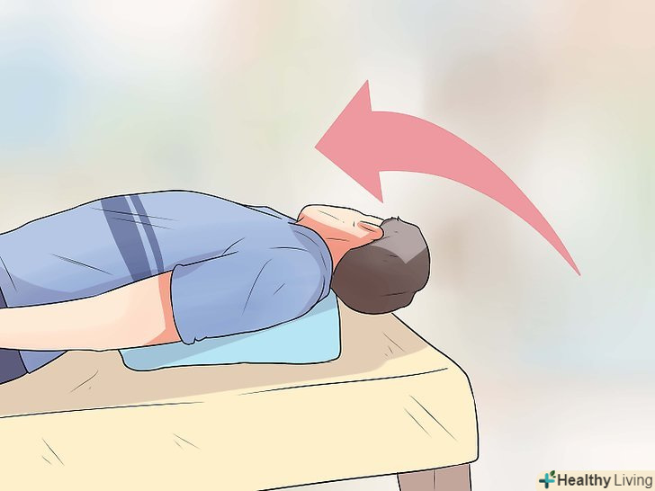 Повертайте головою в різні боки.Сядьте на стілець, опустіть підборіддя до грудей і почніть обертати головою за годинниковою стрілкою. Повільно і акуратно зробіть три оберти. Це зніме спазм в м'язах і послабить запаморочення.[24][25]- Повторіть 3 обертання, на цей раз проти годинникової стрілки. Перш ніж змінити напрямок, зробіть 45-секундну паузу. Потім поверніть голову в одну, потім в іншу сторону, притримуючи голову рукою, щоб створити додатковий опір, яке дозволить потягнути м'язи шиї.