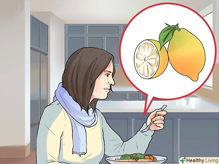 Додавайте в їжу лимон.можна класти в їжу лимонну цедру або додавати 1-2 краплі екстракту лимонних кірок — це не тільки поліпшить смак страв, але і забезпечить ваш організм антиоксидантами і мікроелементами, які допомагають впоратися із запамороченням.- У лимонах міститься велика кількість вітаміну С, який знищує вільні радикали, що призводять до вертиго. Можна змішати лимонний сік з апельсиновим і додати в суміш трохи імбиру.[10]