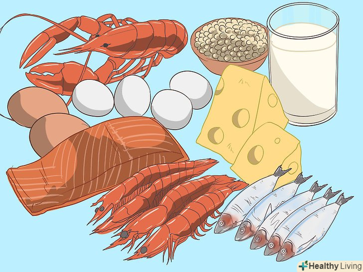 Запитайте у свого лікаря, чи потрібно вам додатково прийматиВітамін B12.симптоми нестачі вітаміну B в організмі включають оніміння верхніх і нижніх кінцівок, проблеми з рівновагою, сплутаність мислення, слабкість, жовтушність шкірних покривів. Якщо ви підозрюєте, що вам не вистачає вітаміну В, проконсультуйтеся з лікарем. Лікар може призначити вам дієту і вітамінні добавки.[15]- Вітамін B12 міститься в червоному м'ясі, птиці, морепродуктах, молочних продуктах і яйцях. Рослини не виробляють вітамін B12, тому дотримання суворої вегетаріанської або веганської дієти може стати причиною нестачі вітаміну В12 в організмі.