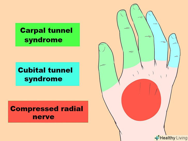 Опишіть лікаря, які саме відділи рук у вас німіють.різні неврологічні захворювання вражають різні відділи рук. Лікар-невролог призначить дослідження, що дозволяють точно визначити защемлення або пошкодження нервів руки. Лікар огляне ваші кисті і передпліччя, попросить вас поворухнути руками і пальцями рук і, при необхідності, направить на рентгенологічне дослідження.[5]- Оніміння великого, вказівного, середнього і безіменного пальців руки, а також відповідної сторони долоні спостерігається при синдромі зап'ястного каналу.
