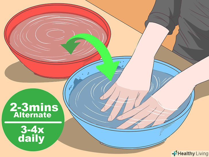По черзі опускайте руки в холодну і теплу воду.наповніть одне відро холодною водою, а інше теплою (не гарячою) водою. По черзі занурюйте руки до ліктя в холодну і в теплу воду на 2-3 хвилини. Повторіть цю процедуру три рази.[7]- Можна робити таку контрастну ванну для рук 3-4 рази на день або як тільки ви відчуєте оніміння або поколювання в руках.
