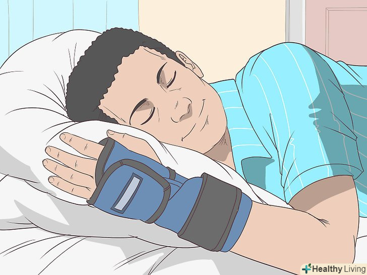 Якщо у вас синдром зап'ястного каналу, надягайте на ніч ортопедичний променезап'ястковий бандаж.при тунельному синдромі рекомендується надягати на зап'ясті спеціальний бандаж, або ортез, що фіксує кисть і передпліччя в нейтральному положенні під час сну.[8]- Попросіть лікаря допомогти Вам підібрати найбільш підходящий ортопедичний променезап'ястковий бандаж.