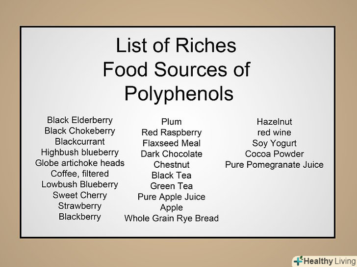 Читайте етикетки на продуктах і вибирайте ті, в яких вказано вміст поліфенолу.у наш час існує безліч таких продуктів. Деякі поліфеноли можуть позначатися як флавоноїди, флавонол або антоціанін. Сучасні продукти, такі як антиоксидантні напої та шоколад, спеціально вказують на етикетці поліфеноли або поліфенольні флавоноїди. Як правило, вказівка такого інгредієнта як поліфенол заборонено для виноробів. Але, незважаючи на це, одна фірма в Орегоні все-таки внесла до складу свого Піно Нуар 2002 року компонент ресвератрол.