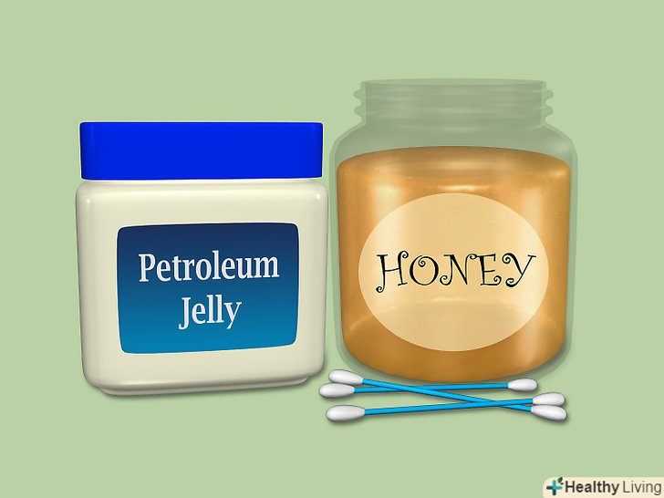Після того, як герпес почне проходити, помажте його вазеліном, щоб захистити від бактерій.- Якщо вазеліну під рукою не виявилося, можна використовувати замість нього мед. Мед має противірусну і антибактеріальну активність, яка допоможе захистити болячку від впливу бактерій. Прикладіть ватний тампон з медом до болячки, потримайте кілька хвилин і змийте.