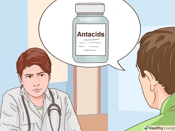 Приймайте препарати, що відпускаються без рецепта. існує ряд препаратів, які ви можете приймати, щоб зменшити симптоми грижі стравохідного отвору діафрагми. Приймайте антациди, такі як міланта, тамс і маалокс. Дані препарати слід приймати до, під час або після їжі, щоб нейтралізувати кислоту шлунка. Антациди мають різну форму випуску. Вони випускаються у вигляді таблеток, жувальних пластинок і в рідкій формі. [13] також ви можете приймати блокатори H2-гістамінових рецепторів, наприклад, ранітидин і пепсид, які блокують виробництво кислоти в шлунку. Максимальний ефект розвивається через 30-90 хвилин після прийому препарату. Препарати даної групи рекомендується приймати перед першим прийомом їжі. Тривалість дії 24 години. [14]- Інгібітори протонної помпи, такі як Нексіум і прілосек за дією схожі з Н2-блокаторами. ІПП блокують кінцевий етап секреції соляної кислоти. Приймайте за 30 хвилин до першого прийому їжі. [15]