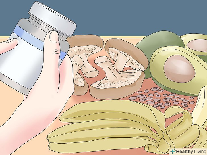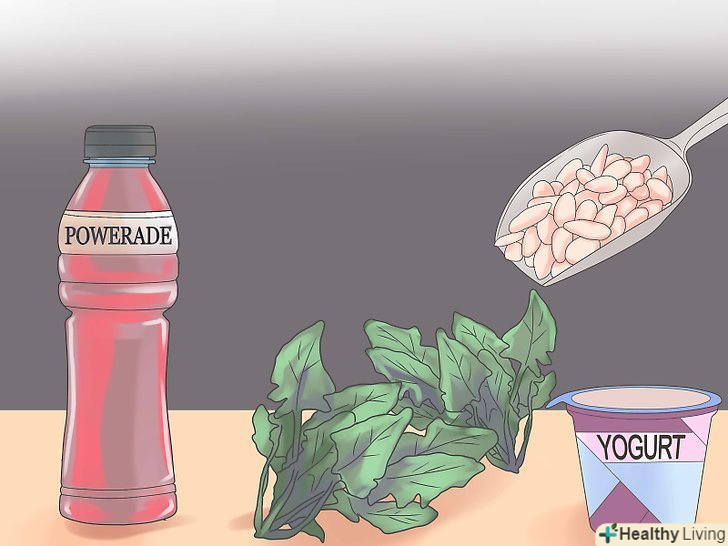 Збільшити рівень калію.якщо недолік калію у вашому організмі викликаний надмірним потінням або блювотою, пийте багато рідини для регідратації вашого організму. Якщо ви відчули симптоми гіпокаліємії під час тренування, зупиніться, сядьте і випийте який-небудь напій, збагачені електролітами. Якщо ви відчули спазм м'язи, потягніть її. Ви також можете відновити нормальний рівень калію в крові, вживаючи продукти з високим вмістом калію.- продукти з високим вмістом калію: біла квасоля, печена картопля, курага, зимова гарбуз, йогурт, сьомга, білі гриби і банани.[6]