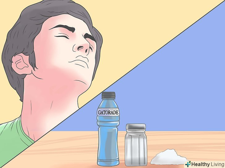 Збільшити рівень натрію.перш за все: відпочиньте, нормалізуйте ваше дихання і розслабтеся. Швидше за все, вам просто потрібно з'їсти що-небудь солоне, тому сядьте і поїжте. Слабкі симптоми нестачі натрію зазвичай починаються через те, що ви давно не їли нічого солоного. Ви також можете випити який-небудь напій, збагачений електролітами.- продукти, багаті натрієм: столова сіль, харчова сода, сухі бульйони, соєвий соус, салямі, бекон, гра і сир.[5]