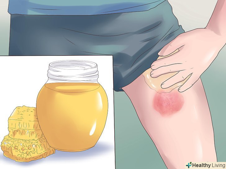 Нанесіть на рану мед чайного дерева.мед чайного дерева має антибактеріальні та противірусні властивості.[11] він може допомогти прискорити одужання висипань герпесу і простудних болячок. Вам необхідно нанести густу масу меду на уражену ділянку шкіри. Під час курсу лікування наносите мед на ранку по кілька разів на день, щоб зробити його дію більш ефективним.- Наносите мед прямо на ранки за допомогою ватних паличок або ватних дисків. Спочатку ранку може щипати, але незабаром ви відчуєте оніміння ураженої ділянки шкіри.