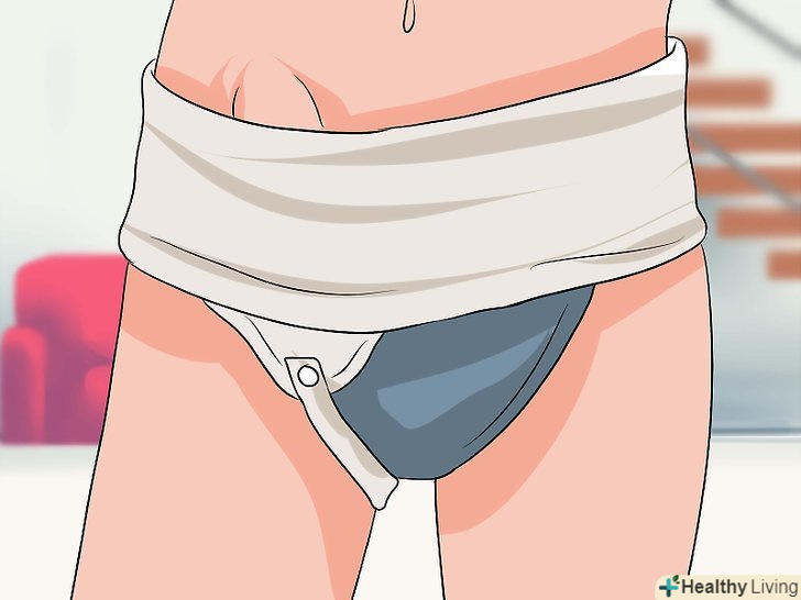 Носіть підтримуючу пов'язку або грижовий бандаж.якщо у вас пахова грижа, можливо, Вам варто носити спеціальну підтримуючу пов'язку, яка також допоможе знизити біль. Порадьтеся з лікарем щодо грижового бандажа, схожого з підтримуючим нижньою білизною. Можна також носити підтримуючі ремені, які допоможуть утримати грижу на місці. Щоб як слід закріпити ремені або бандаж, ляжте і щільно зав'яжіть їх навколо грижі.- Підтримуючі пов'язки або бандаж слід носити лише протягом нетривалого часу. Вони жодним чином не вилікують грижу.[4]