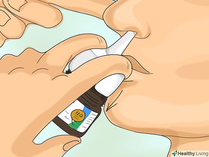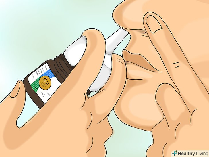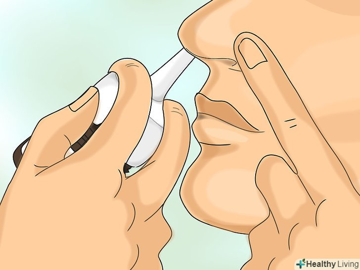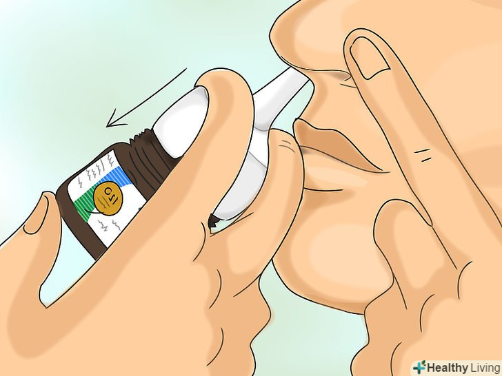 Закрийте одну ніздрю пальцем руки.- Нахиліться трохи вперед і вставте сопло в іншу ніздрю. Флакон у вашій руці повинен залишатися у вертикальному положенні.