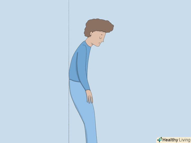 Зіпріться нижньою частиною спини об стіну, злегка нахиліться вперед і розслабтеся.Встаньте спиною до стіни, ноги на ширині плечей. Злегка нахиліться вперед, покладіть руки на стегна. Розслабте плечі і руки, потім зосередьтеся на диханні. Залишайтеся в цьому положенні, поки дихання не нормалізується.[15]- Через 2-3 хвилини вам стане легше дихати.