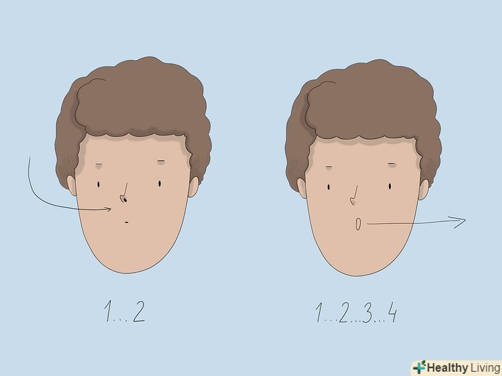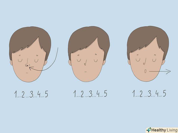 Для заспокоєння практикуйте дихання на рахунок.уповільнити прискорене дихання можна, якщо вважати про себе: коли видихаєте, затримуєте дихання, видихаєте. Зробіть вдих, повільно вважаючи про себе до п'яти, потім затримайте дихання, знову вважаючи до п'яти. Далі робіть видих, повільно рахуючи до 5. Повторіть 5 разів, щоб дихання увійшло в природний ритм.[2]- Можна вважати по-різному, це нормально. Наприклад, якщо хочете, можна вважати не до п'яти, а до трьох. Робіть, як вважаєте за потрібне.