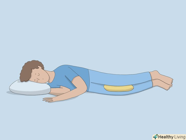 Спіть на боці з подушкою між колінами.ви можете відчувати брак повітря під час сну, особливо якщо хворі або хропіть. Щоб вам було легше дихати, спіть, лежачи на боці. Підкладіть подушки під голову, щоб підняти верхню частину тіла, і подушку між ніг, щоб вирівняти хребет.[18]- Якщо ви перевертаєтеся уві сні, підкладіть ковдри або подушки, щоб вам було незручно перевертатися в інше положення.