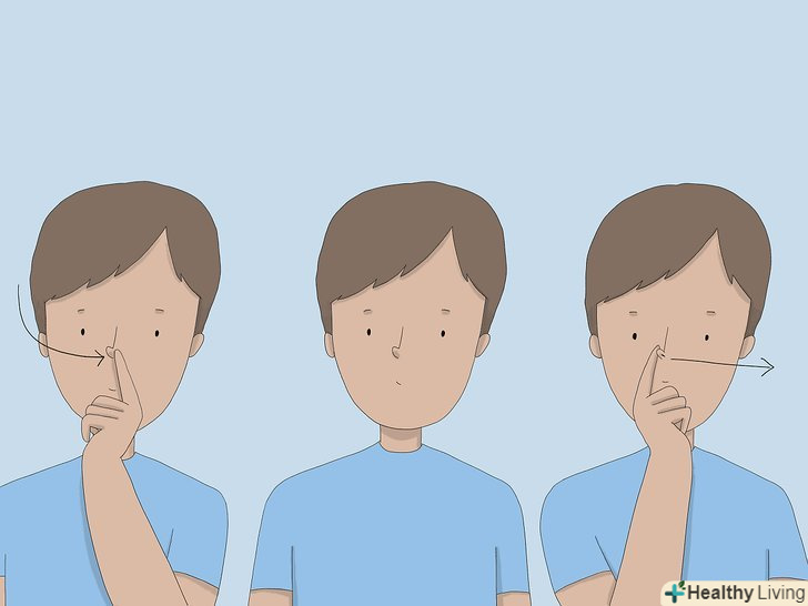 Виконуйте поперемінне дихання через ніздрі, щоб впоратися зі стресом.затисніть одну ніздрю пальцем. Потім повільно вдихайте через вільну ніздрю, поки не наповняться легені. Затримайте дихання на 1 секунду, потім затисніть цю ніздрю і повільно видихніть повітря через іншу. Тепер вдихніть через неї, затисніть її і видихніть через першу ніздрю.[3]- Продовжуйте поперемінне дихання протягом 3-5 хвилин, щоб відновити природне дихання.