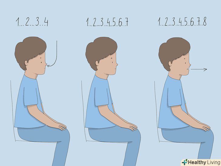 Для розслаблення використовуйте метод дихання "4-7-8".Сядьте, випряміть спину, потім притисніть кінчик язика до верхнього неба. Ваша мова повинна весь час залишатися в такому положенні. Видихніть повітря через рот, щоб очистити легені. Прикрийте рот, тепер починайте вдихати через ніс, вважаючи в розумі до 4. Потім затримайте дихання, рахуючи до 7. На рахунок 8 видихніть повітря, видаючи при цьому свистячий звук.[4]- Повністю пройдіть цикл дихання "4-7-8" для заспокоєння і розслаблення.