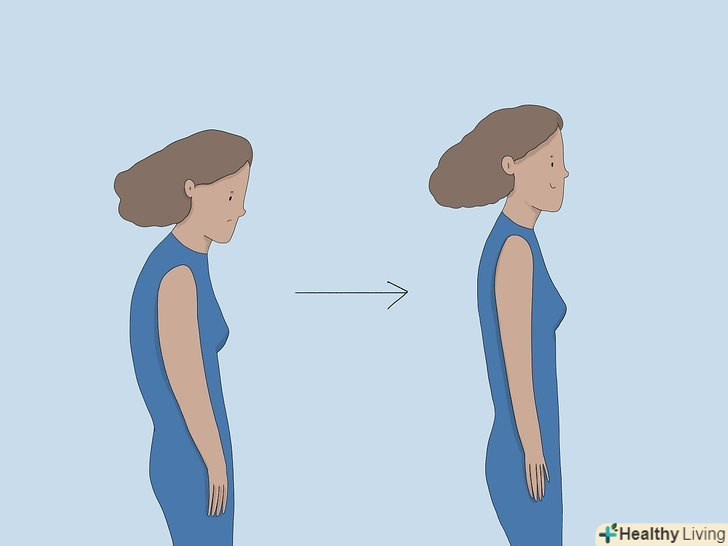 ТримайтеСпину рівно, щоб дихати було легше.при сутулості стискаються легені і перекриваються дихальні шляхи, що ускладнює дихання. Випрямляйте спину і коли сидите, і коли стоїте. Крім того, відводите плечі назад і піднімайте підборіддя вгору. Це допоможе вам вільніше дихати.[6]- Дивіться в дзеркало, щоб переконатися, що у вас правильна постава. Тренуйтеся стояти або сидіти прямо, поки не відчуєте себе комфортно.