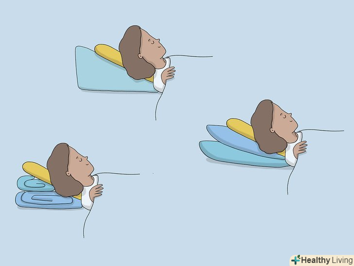 Підніміть узголів'я, якщо вам важко дихати уві сні.можливо, вам важко дихати лежачи, особливо вночі. Якщо таке трапляється, використовуйте подушки або як-небудь по-іншому підніміть верхню частину тіла. Це послабить тиск на легені, щоб можна було краще дихати уві сні.[7]- Можна також спробувати покласти складену ковдру під подушку.