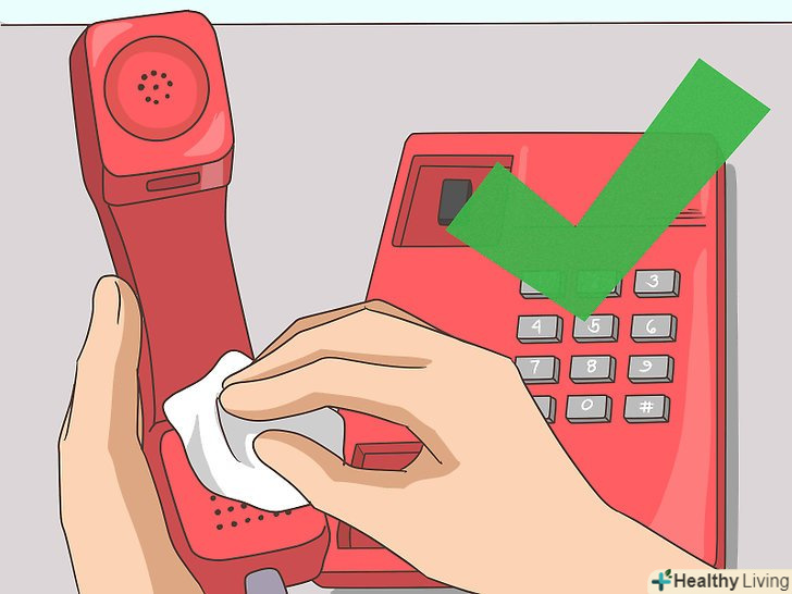 Дезінфікуйте навколишні предмети.ви знизите ризик заразитися, якщо будете протирати поверхні, до яких торкаєтеся протягом дня. Приділяйте особливу увагу своєму робочому місцю. Застудою дуже легко заразитися від колег по роботі. Протирайте дезинфікуючим розчином свій комп'ютер, телефон і письмове приладдя на початку і кінці робочого дня.- Те ж саме можна робити вдома. Протирайте ті поверхні, до яких часто торкаються, наприклад крани у ванній кімнаті.