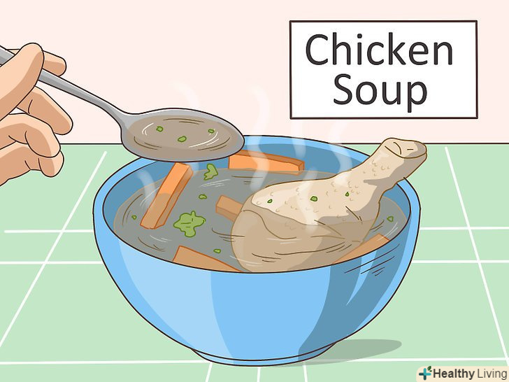 Правильно харчуйтеся.ваша мама була права: курячий суп дійсно допомагає полегшити симптоми застуди і прискорити одужання. Хоча вчені продовжують вивчати це питання, в деяких дослідженнях було показано, що курячий суп при прийомі всередину перешкоджає поширенню слизу і тим самим полегшує симптоми застуди верхніх дихальних шляхів. Отримані результати свідчать про те, що схожим ефектом володіють і домашній, і покупної курячий суп.[3]- Встановлено, що симптоми застуди допомагають полегшити і деякі інші продукти. Наприклад, в йогурті містяться корисні бактерії, які допомагають організму боротися з інфекцією.[4]
