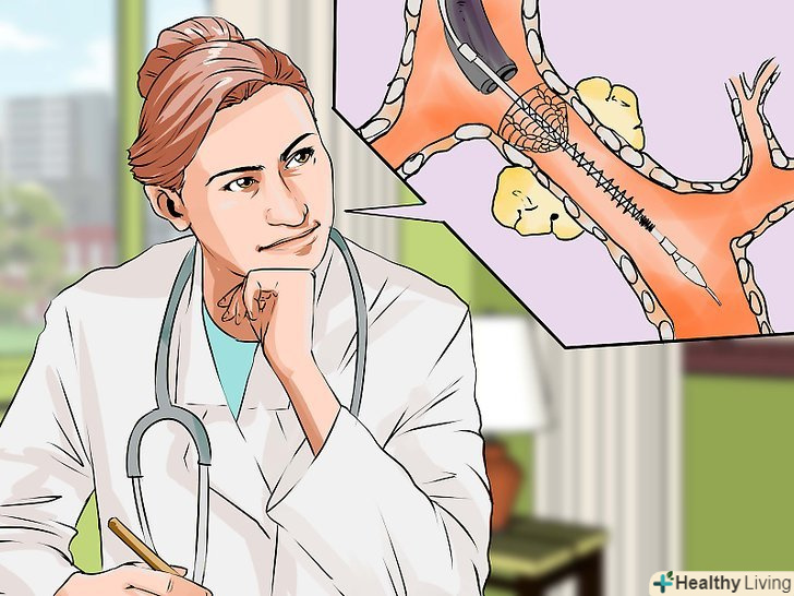 Пройдіть бронхоскопію, якщо у вас аспіраційна пневмонія.вона виникає, коли людина давиться і випадково вдихає в легені невеликий предмет. Якщо це сталося і з вами, цей предмет необхідно буде дістати.[18]- Лікар просуне через ніс або рот невеликий ендоскоп прямо в легені і витягне предмет. Швидше за все, вам призначать анестетик, щоб викликати оніміння носа, рота і дихальних шляхів. Вам також можуть призначати загальний наркоз або препарат, який допоможе вам розслабитися. Видалення цього предмета допоможе вам швидше одужати.