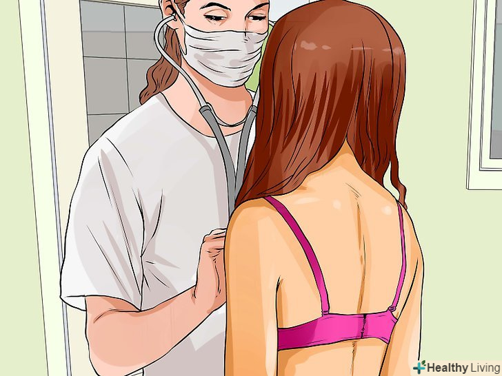 Дозвольте лікарю послухати ваші легені.лікар може попросити вас підняти або зняти сорочку, щоб послухати ваші легені за допомогою стетоскопа. Це зовсім не боляче. Єдиний дискомфорт, який ви можете відчути, це холод від дотику стетоскопа до голої шкіри. Лікар попросить вас глибоко дихати, поки він буде прослуховувати ваші легені спереду і ззаду.[7]- Скрегіт і шуми в легенях можуть свідчити про наявність інфекції.