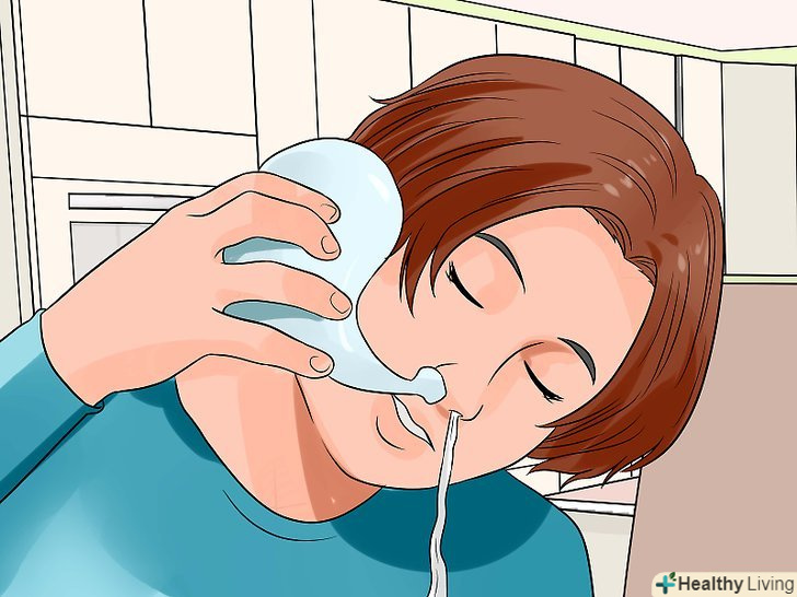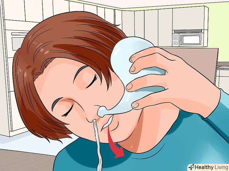 Прочистіть носові порожнини.виливши соляний розчин з пристосування через обидві ніздрі, видихніть через ніздрі перед виконанням вдиху через ніс. Також можна висякатися, щоб видалити залишки розчину і слиз / бруд.[26]