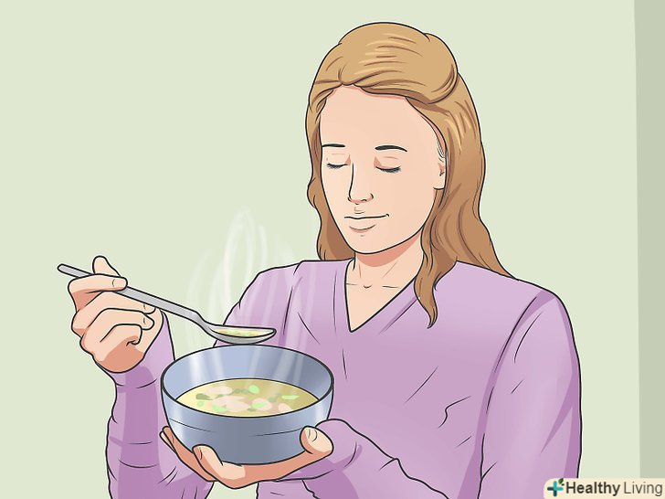 Їжте теплий курячий суп. Пар від супу допоможе відкрити мембрани верхніх дихальних шляхів, його тепло заспокоїть ваше горло,[20] А міститься в курятині білок додасть вам сил. Крім того, хіба є більш приємна їжа під час хвороби, ніж тарілка теплого супу?