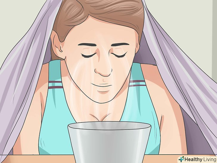 Вдихайте пару над киплячою водою в каструлі.Закип'ятіть воду в каструлі, потім зніміть каструлю з плити і поставте її на жароміцну поверхню. Потім, тримаючи голову над водою, вдихайте пар. Для більшого ефекту можна накрити голову рушником.- Для більшої користі додайте у воду листя чебрецю (чебрецю).[24]