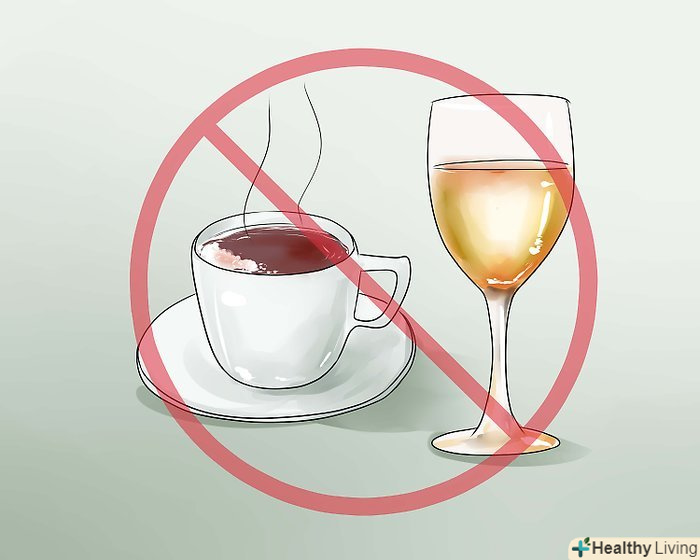 Утримуйтеся від спиртних і кофеїновмісних напоїв. Алкоголь і кофеїн не насичують організм рідиною, а зневоднюють його, вони висушують горло і всі інші органи.- Алкоголь і кофеїн безпосередньо сушать рот і горло, а також сприяють загальному зневоднення організму через більш частого сечовипускання.