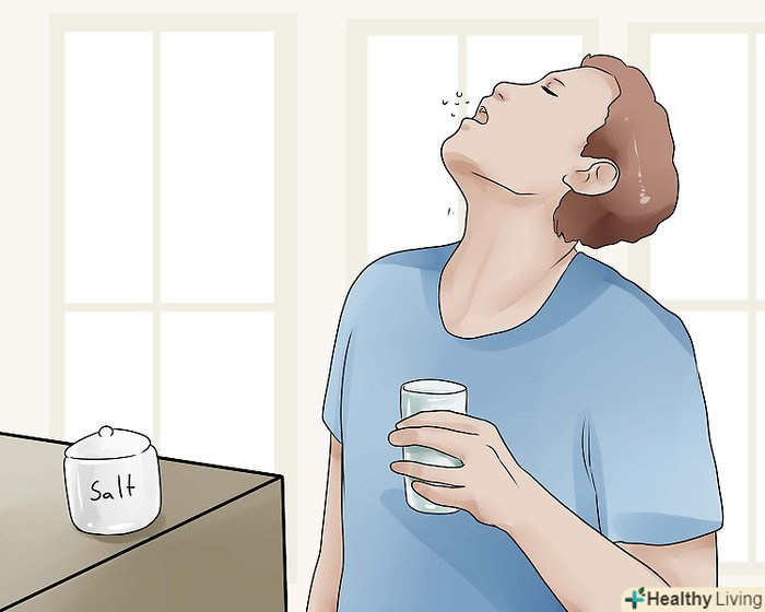 Полощіть горло солоною водою.солона вода являє собою ще один засіб, який часто використовують для лікування горла, і при певних обставинах вона може допомогти і при сухості в горлі.- Якщо сухість у горлі викликана сезонними подразниками, такими як сухе повітря або алергени, полоскання горла солоною водою може принести користь. Однак якщо хронічна сухість в горлі пов'язана з іншими причинами, солона вода може дратувати горло.