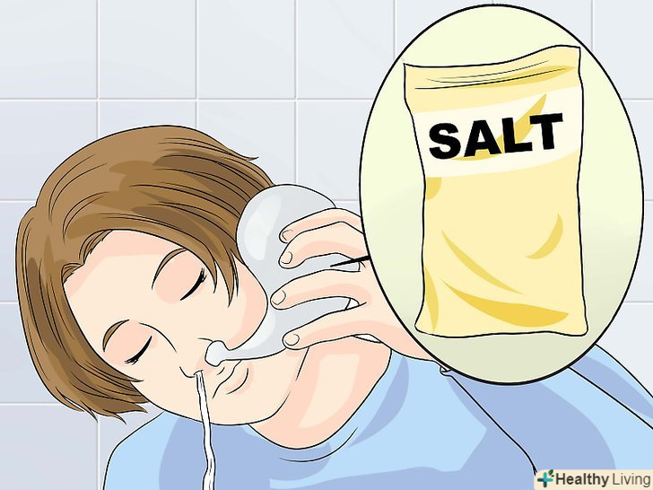 Очищайте ніс сольовим розчином.солона вода може знизити запалення в носі і підсушити слиз, яка блокує дихальні шляхи. Сіль уповільнює вироблення адипонектину-речовини, яке провокує запалення.[11]- Розчиніть половину столової ложки (або менше) столової солі в чашці окропу. Охолодіть до температури тіла. Помістіть розчин в чисту гнучку пляшечку або в посудину для промивання носа і очистіть носові канали.