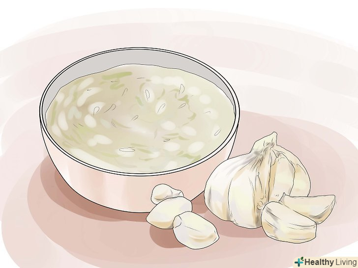 Спробуйте часниковий відвар. Подібно імбиру часник володіє дивовижними цілющими властивостями. Він вже давно використовується як засіб для лікування вологого або сухого кашлю. Для того, щоб зробити часниковий відвар, пропустіть через м'ясорубку цілу головку свіжого часнику. Залийте її в літром окропу і поваріть протягом 20-30 хвилин. Дайте охолонути до прийнятної температури, а потім Їжте / пийте відвар протягом дня. Волога з бульйону допоможе полегшити біль в горлі, в той час як часник посприяє позбавленню від кашлю.