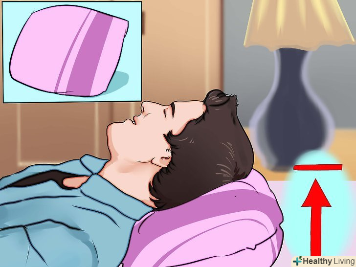 Тримайте голову піднятою.вирушаючи спати, покладіть під голову кілька подушок, щоб її підняти. Таким чином, вам буде легше дихати, а слиз не накопичиться в ваших пазухах.[18]