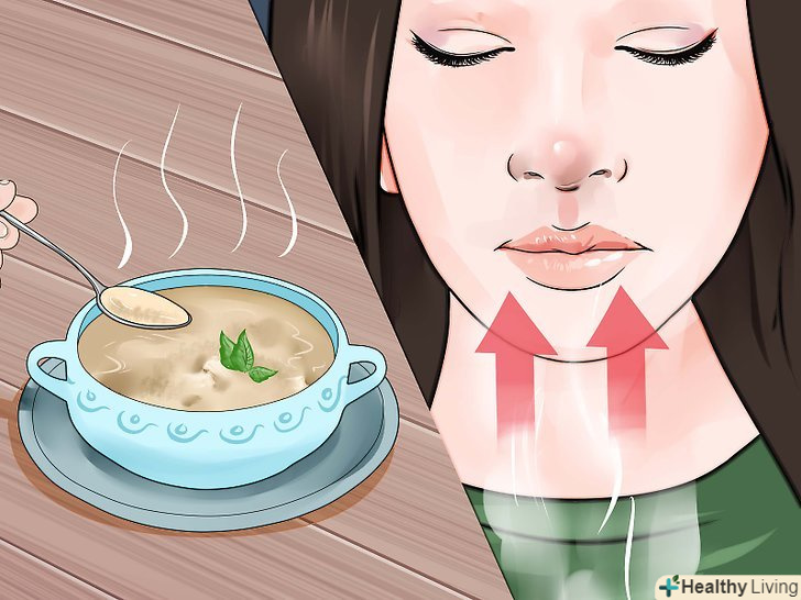 Дихайте парою при будь-якій можливості. якщо ви зайняті і не можете закип'ятити воду, посидіти і подихати парою, тоді нахиліться над парою, який виходить від гарячого чаю або тарілки супу під час роботи або на прогулянці. Мета і ефект від інгаляції залишається все тим же, навіть якщо джерело пара зовсім інший.[3]- Зволожувач повітря також може бути використаний для подібного методу очищення пазух носа.