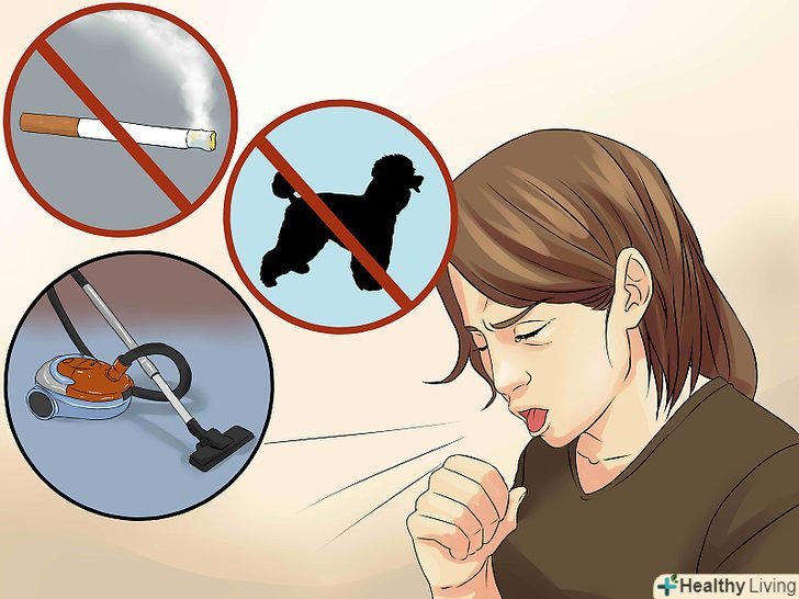 Видаліть з дому всі подразники.Ароматизовані засоби, дим і алергени можуть викликати хронічний кашель. Роздратування носових проходів можуть викликати ароматичні свічки, лосьйони і освіжувачі повітря. Це може привести до скупчення слизу і кашлю.[8]- Тютюновий дим є ще одним поширеним подразником, який здатний викликати кашель. Киньте палити і попросіть інших у вашому домі також відмовитися від цієї шкідливої звички або курити за межами будинку.