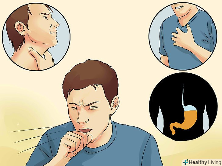 Визначте, чи не викликаний кашель ГЕРХ. ГЕРХ, або гастроезофагеальна рефлюксна хвороба (її називають також кислотним рефлюксом або хронічною печією) є дуже поширеною причиною безперервного тривалого кашлю.[12] ГЕРХ розслабляє шлунок, і шлунковий сік піднімається в горло через стравохід, що викликає печію, біль і кашель. При цьому кашель зазвичай сильніше вранці.- ГЕРХ, астма і стікання слизу по задній стінці глотки відповідальні приблизно за 90% випадків хронічного кашлю.