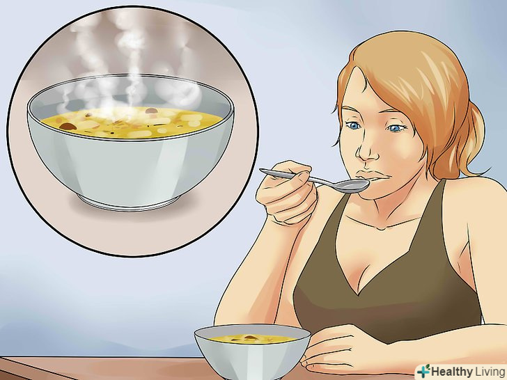Спробуйте їсти курячий суп.якщо кашель викликаний застудою, курячий суп допоможе зняти закладеність дихальних шляхів. Дослідження показали, що курячий бульйон має певні протизапальні властивості, що допомагає полегшити закладеність.[3][4]- Суп допомагає розрідити слиз, яка викликає роздратування і кашель.