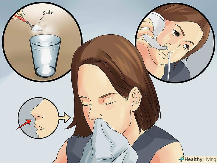 Спробуйте промивати ніс сольовим розчином.промивання пазух носа сольовим розчином дозволяє видалити стікає по носоглотці слиз, яка дратує горло, і тим самим полегшити кашель. Сольовий розчин для промивання носа можна придбати в аптеці або приготувати самостійно.[5]- Щоб приготувати сольовий розчин, розведіть ⅛ чайної ложки (близько 1 грама) солі в склянці (250 мілілітрах) теплої води. Змочіть розчином чисту ганчірку.