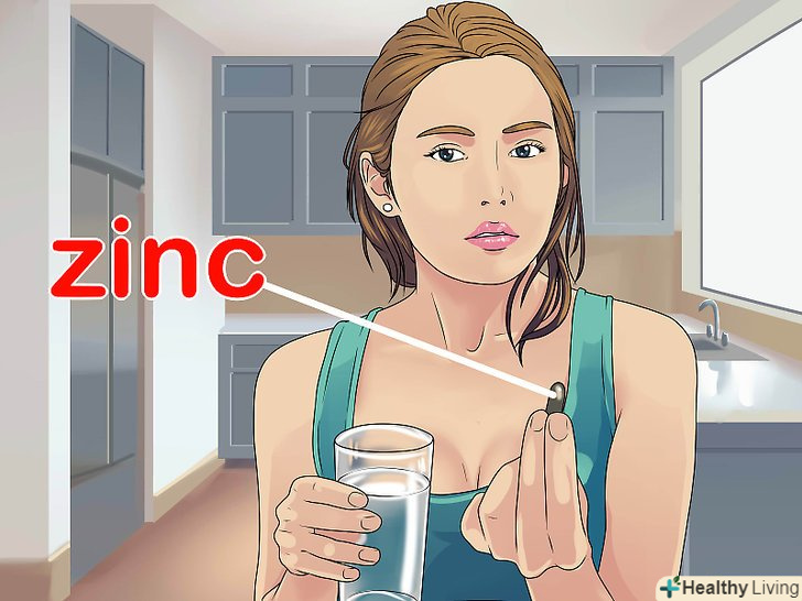 Подумайте про прийом цинку.як і у випадку з вітаміном С, існує безліч суперечливої інформації про ефективність добавок з цинком при боротьбі з застудою. Однак на відміну від вітаміну С, занадто великі дози цинку небезпечні для здоров'я. Проте, прийом цинку в допустимих межах зазвичай безпечний і, можливо, допомагає впоратися з застудою.- Прийом більше 50 міліграмів цинку в день протягом тривалого часу може бути шкідливим для вашого здоров'я. Були повідомлення про те, що назальні спреї з цинком можуть завдати непоправної шкоди нюху.