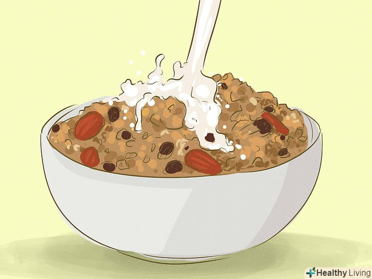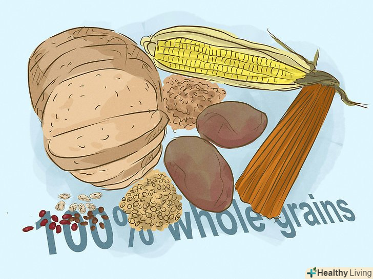 Вибирайте цільнозернові продукти замість продуктів з очищеного зерна. коли мова йде про такі продукти, як хліб, рис або макарони, більш корисні ті, що виготовлені з цільного зерна, а не з очищеного.- Цільнозернові продукти піддаються меншій обробці і містять в собі цілі зерна, включаючи висівки, ендосперм і зародок. Вони зазвичай більш багаті клітковиною, білками та іншими життєво важливими поживними речовинами. [25] зупиніть свій вибір на коричневому рисі, кіноа, цільнозернових вівсяних пластівцях або цільнозерновому пшеничному хлібі.