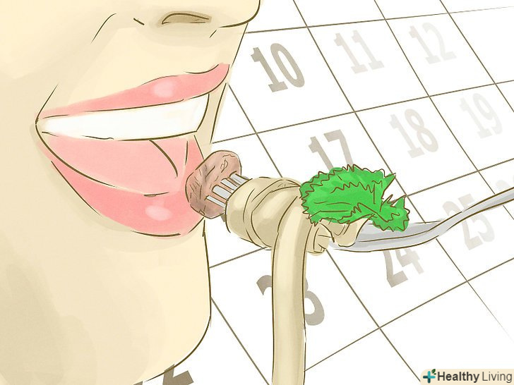 Щодня дотримуйтесь режиму харчування. вживання правильних продуктів - тільки половина справи. Дотримуватися режиму харчування рівноцінно (якщо не більше) важливо в цьому питанні. Вам слід зрозуміти наступне: якщо харчуватися занадто часто або, навпаки, недостатньо часто, неправильні перерви між прийомами їжі приведуть до того, що обмін речовин у вашому організмі сповільниться, і відчуття голоду ви будете відчувати нерегулярно. Важливо зробити так, щоб ви адекватно харчувалися протягом усього дня, уникаючи при цьому втоми, занепаду сил і зберігаючи оптимальну працездатність. [5]- Кожен день важливо послідовно регулярно харчуватися. [6] в цілому необхідно дотримуватися режиму харчування з трьох-чотирьох прийомів їжі в день. Деякі люди вважають за краще харчуватися по чотири-п'ять разів на день невеликими порціями, тоді як інші їдять всього три рази на день. Все це індивідуально для кожної людини, але в будь-якому випадку неправильно пропускати будь-які прийоми їжі.