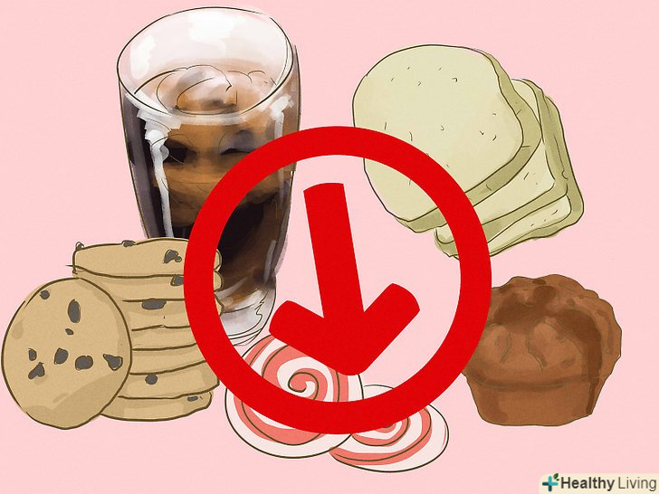 Обмежте вживання продуктів глибокої переробки з низькою поживною цінністю. ці продукти зазвичай містять в собі більше цукру, жиру, солі і калорій в цілому. [26] щоб сприяти правильному харчуванню і підтримці здорової ваги, важливо скоротити вживання такої їжі.- Обмежте вживання цукерок, тортів, печива, випічки, заморожених напівфабрикатів, переробленого м'яса, чіпсів і крекерів.