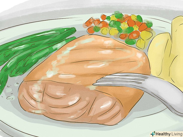 Вибирайте джерела чистого пісного білка. пісні Білки є істотно важливими поживними речовинами для вашої дієти. Вони лежать в основі більшості процесів вашого організму і його функцій. [19] вибір здорових джерел чистого білка для кожного основного прийому їжі допоможе вам задовольнити повсякденні потреби вашого організму.- В цілому одна порція білка повинна становити 85-115 г.це рівноцінно розміру вашої долоні (без урахування пальців) або колоди карт. [20]