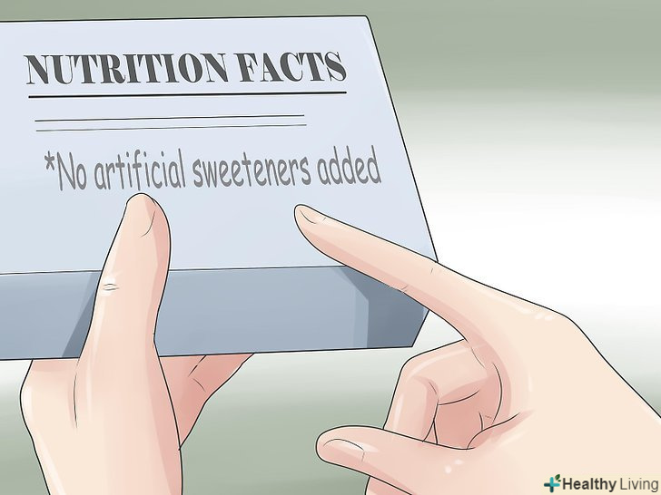 Уникайте штучних підсолоджувачів. штучні підсолоджувачі мають тенденцію до збільшення рівня цукру в крові. Зокрема, уникайте підсолоджувачі, що містять аспартам або сорбітол. [15] ви повинні перевірити етикетку харчового продукту, перш ніж його купувати, щоб побачити, які підсолоджувачі були використані для його приготування.- Пам'ятайте, що напис «без додавання цукру» може вказати на те, що цукор не був доданий в процесі виробництва, але там можуть бути штучні підсолоджувачі. Натуральна їжа також може містити велику кількість цукру, тому уважно читайте етикетку.
