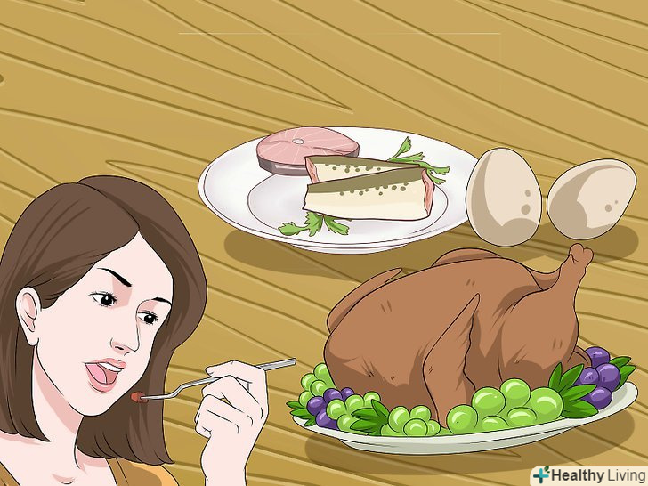 Їжте багато білка. хоча ранні дослідження припускали, що білок насправді шкідливий для кісткової маси, нові дослідження показують, що якщо вживати білок в помірних кількостях, він сприяє засвоєнню кальцію. [3] [4] чоловікам потрібно вживати близько 56 грам білка в день, жінкам – близько 46 грам, а вагітним жінкам – 70 грам. Їжте багато пісного білка, він міститься в наступних продуктах:- Риба